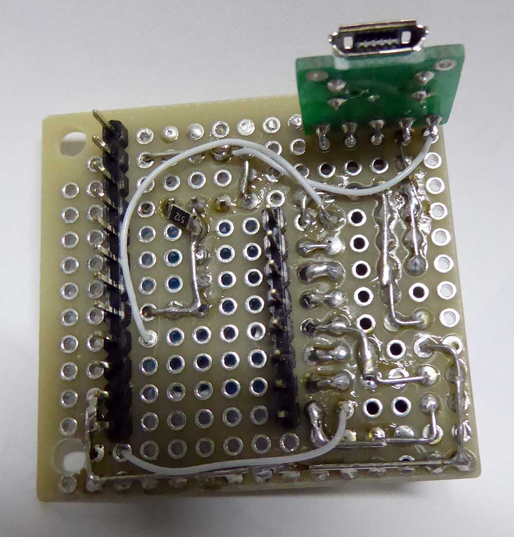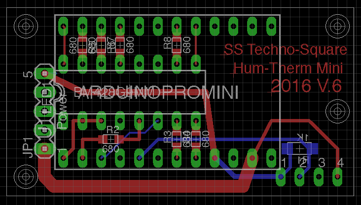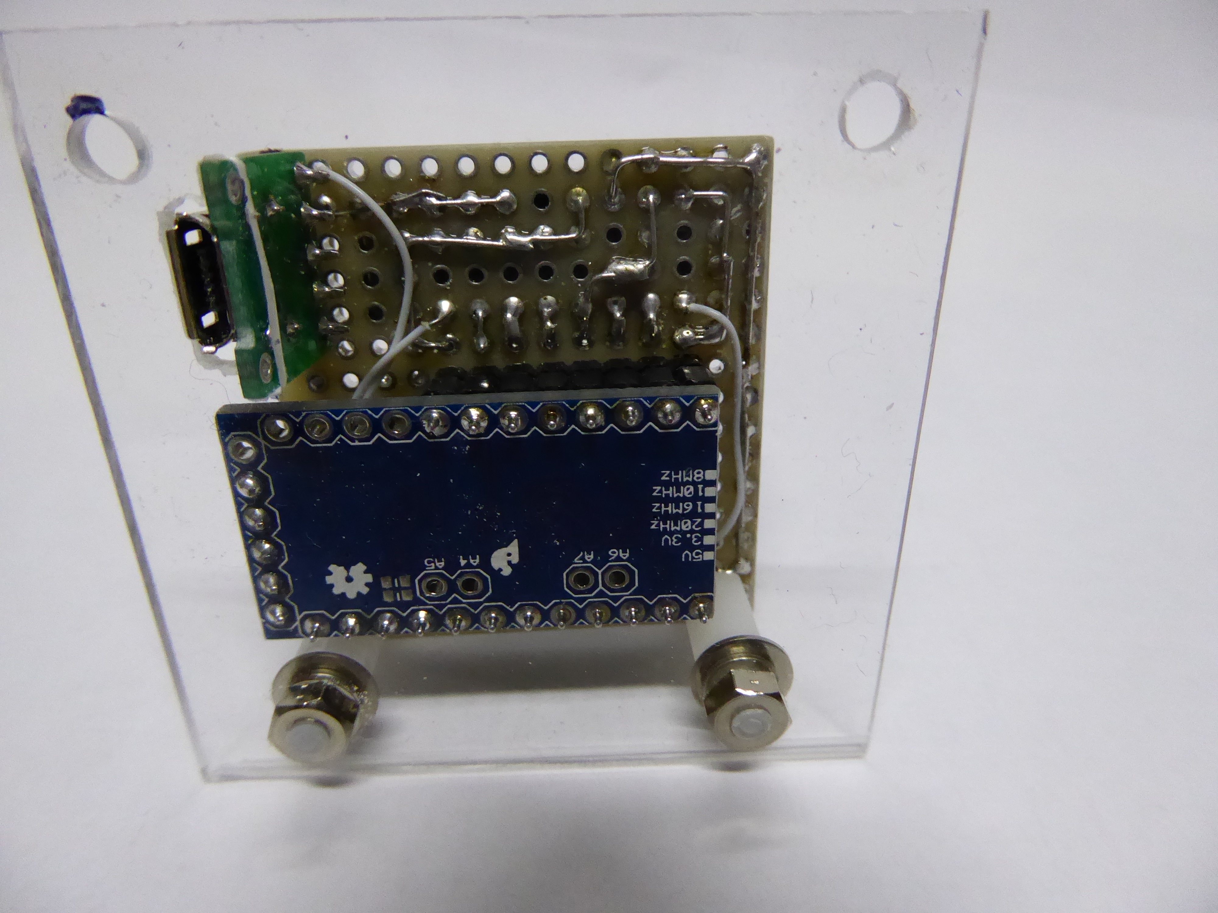 LEDが9mmと小さいので、何としても小型化を目指したかった。 そのため、CPUとLEDの接続には苦労した。途中に限流抵抗を入れなくてはならない。立体配線にしたり、SMDタイプを使ったり色々工夫を凝らした。 写真のものは5号機で、これが割と小さくかつ作りやすく配置できたものの1つだ。 1号機は「あちゃん」を使って表裏を抵抗と配線で繋いで苦労したが、思ったほど小さくはならなかった。