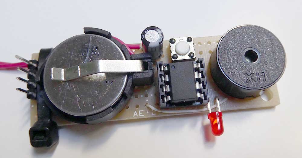 チクタクタイマの外観。電池とスピーカーがその大半を占める。今回は電池も基板上に載せたのがちょっとまずかった。電池を外付けにするともっと色々なケースに入れられると思う。 今回の物は、フリスクのケースに入るので、これはこれでOKなのではあるけど。