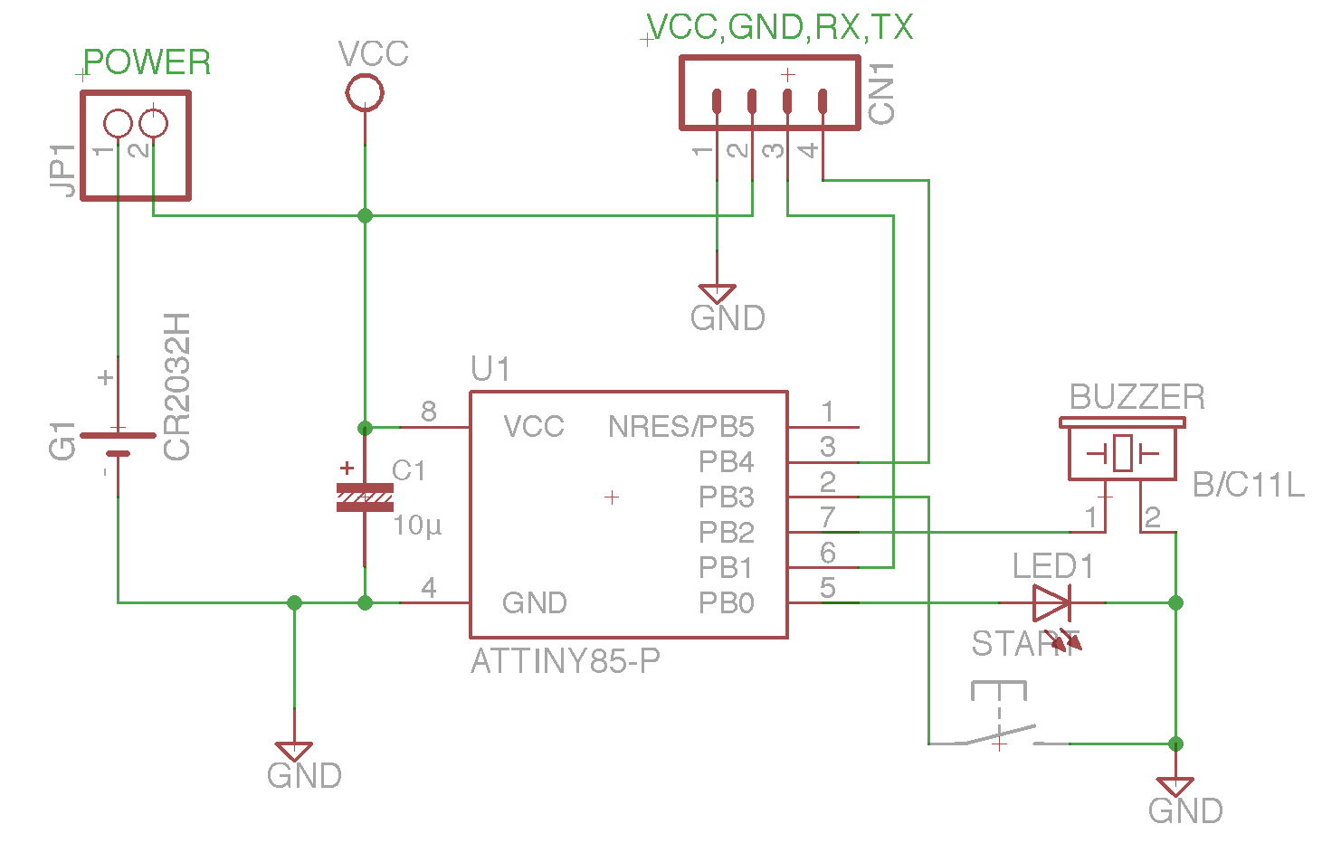今回のタイマーは入力に、スタートスイッチ、出力にLEDとスピーカー、そしてシリアル入出力が2本。これで全部の端子を使い切った。