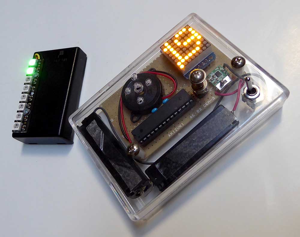 これはバーグラフ表示のものと8x8ドットマトリクスでメッセージを表示するものの2種類を作った。