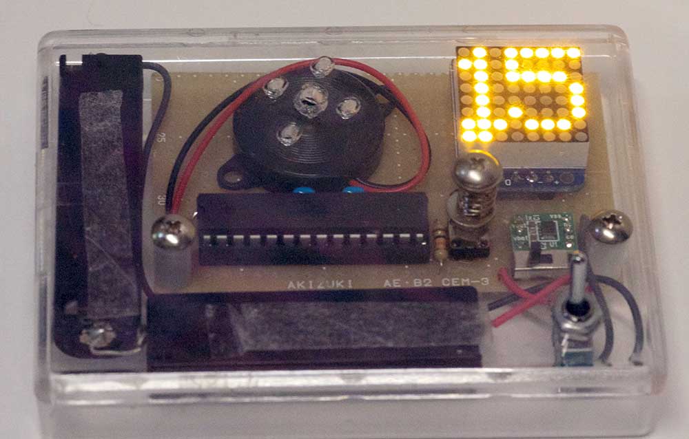 当初はこちらもAtTinyの積もりだったからだ。結果的には、周辺デバイスが結構大きかったのでCPUのオーバーサイズは殆ど問題にならなかった。本当に小さくしようと思えば、圧電スピーカーをもう少し小さくしたり、バッテリを小さいものにするなど、工夫はできると思う。