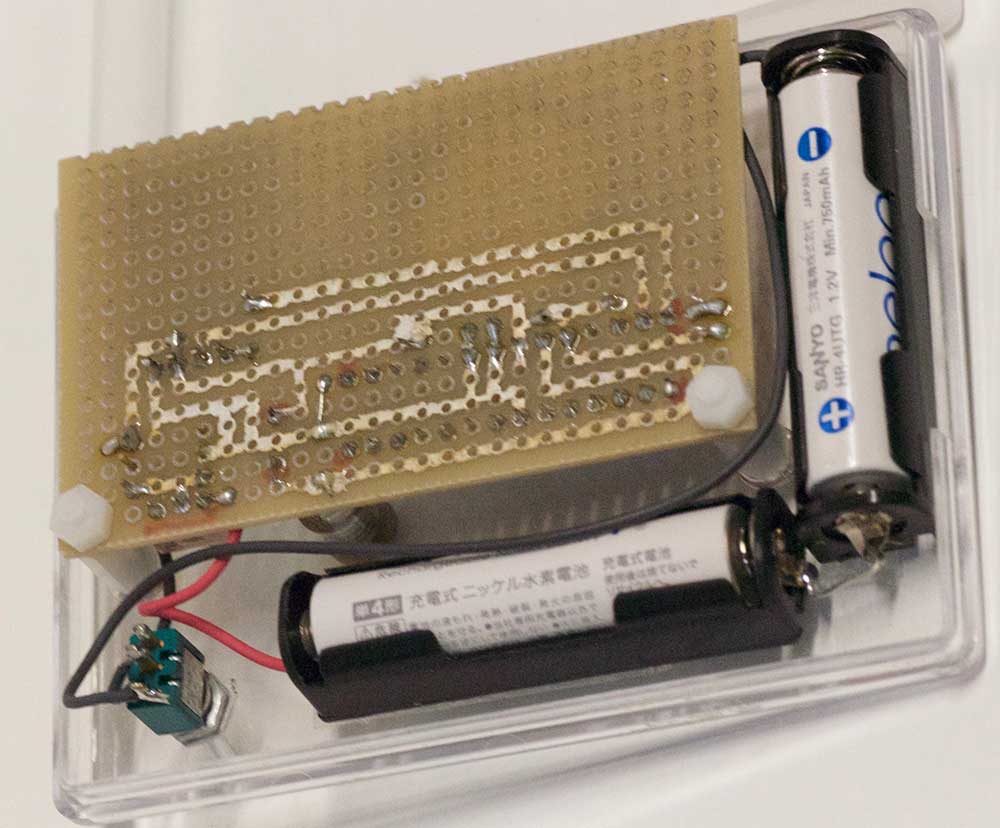 「何も無いじゃないか!」と、言われそうだ。だがまさにそのとおり。8PのAtTinyに電源2本と、Neopixelへ繋ぐ線が1本、合計3本の線を繋いだだけだ。ケースは単4電池3本用の電池ボックス。ここに2本だけ電池を入れている。