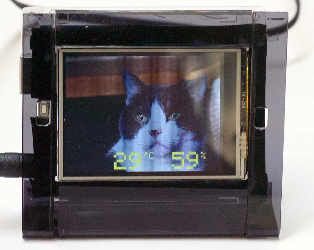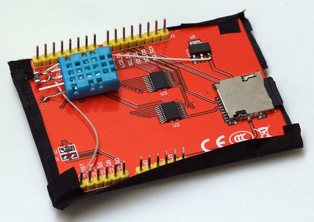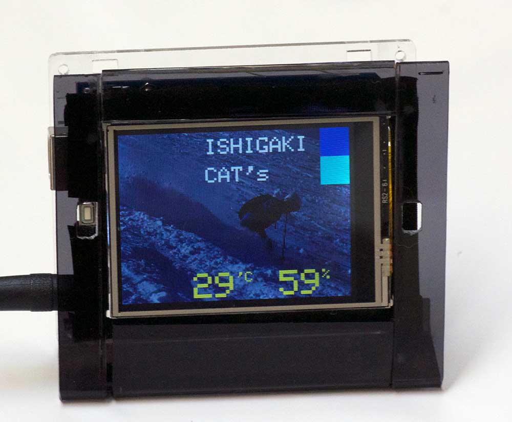 また、ただ写真を表示するだけでは芸がないので、いつものDHT11を基板の裏に貼り付けて、温度・湿度を同時に表示するようにしてある。