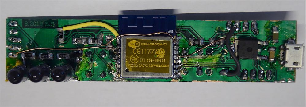 中央が言わずと知れたWROOM-02。右側に5V(USB)から3.3Vに変換する電源部。左側には赤外線送信用のLEDが3つ。