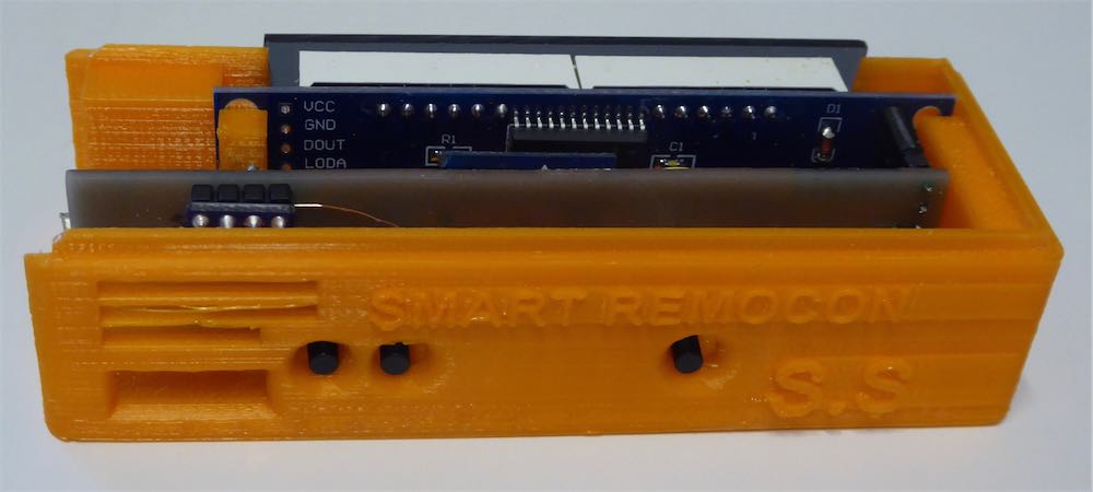 手前が、今回作った「スマートリモコン」。ESP-WROOM-02が中心。表示はMAX7219を使ったLED表示だ。