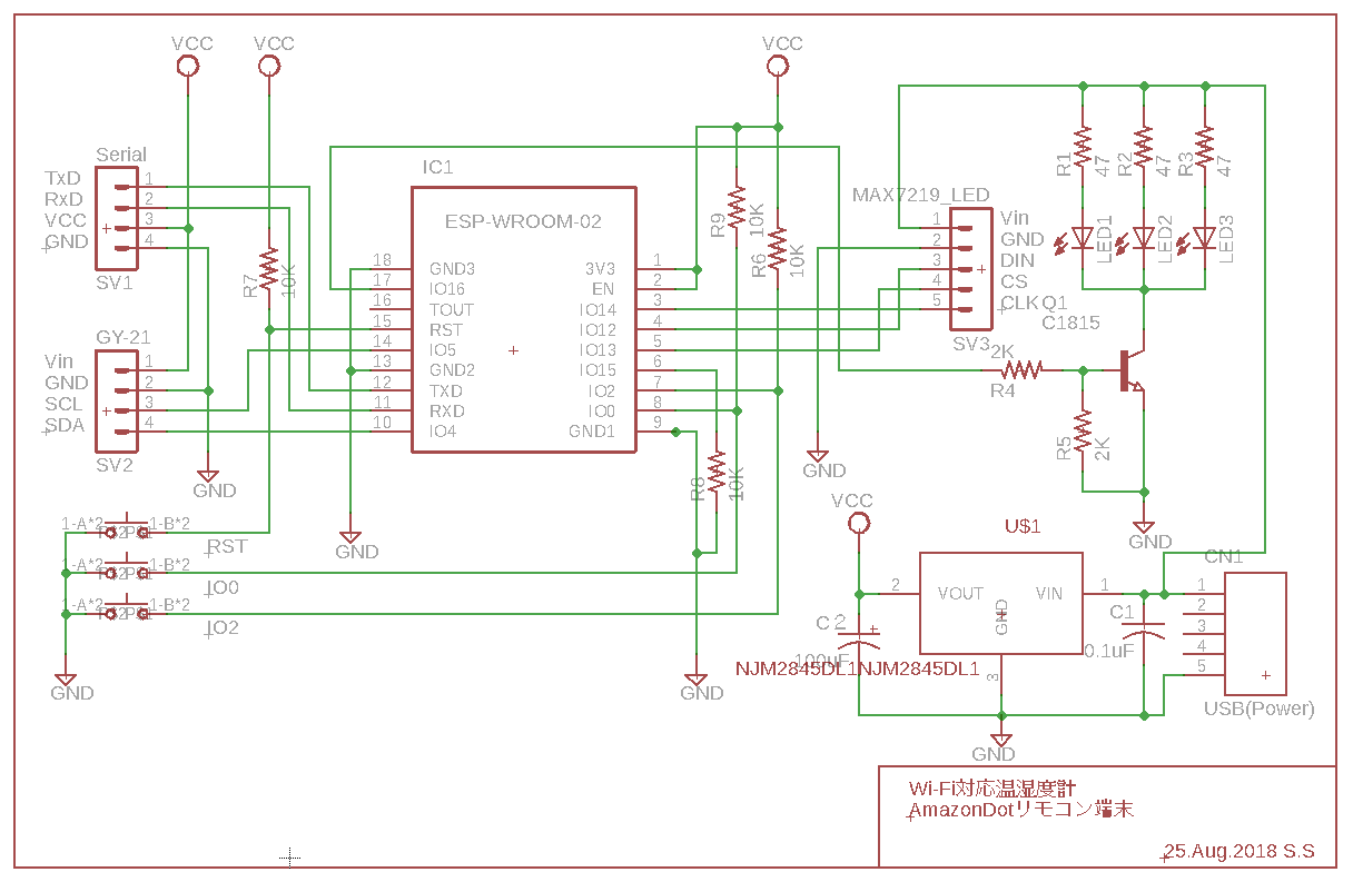 ただ、リモコン端末だけを部屋に置いておくのも味気ないので、ついでに温度や湿度を表示することにして、回路を書いて基板を作った。