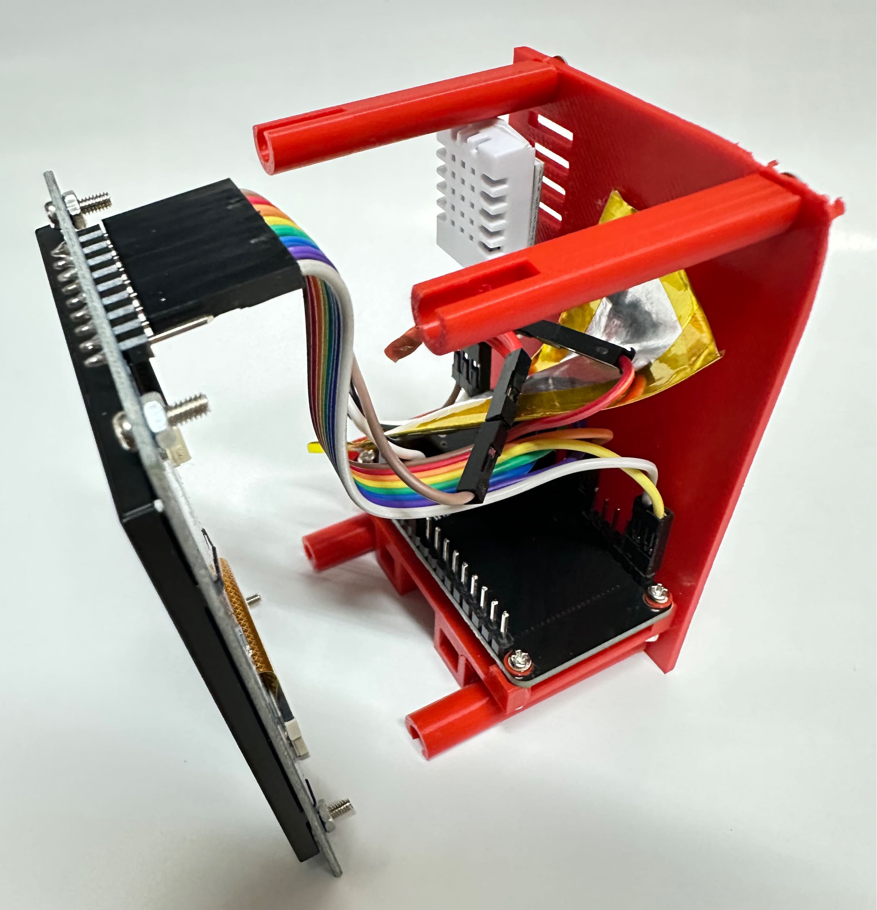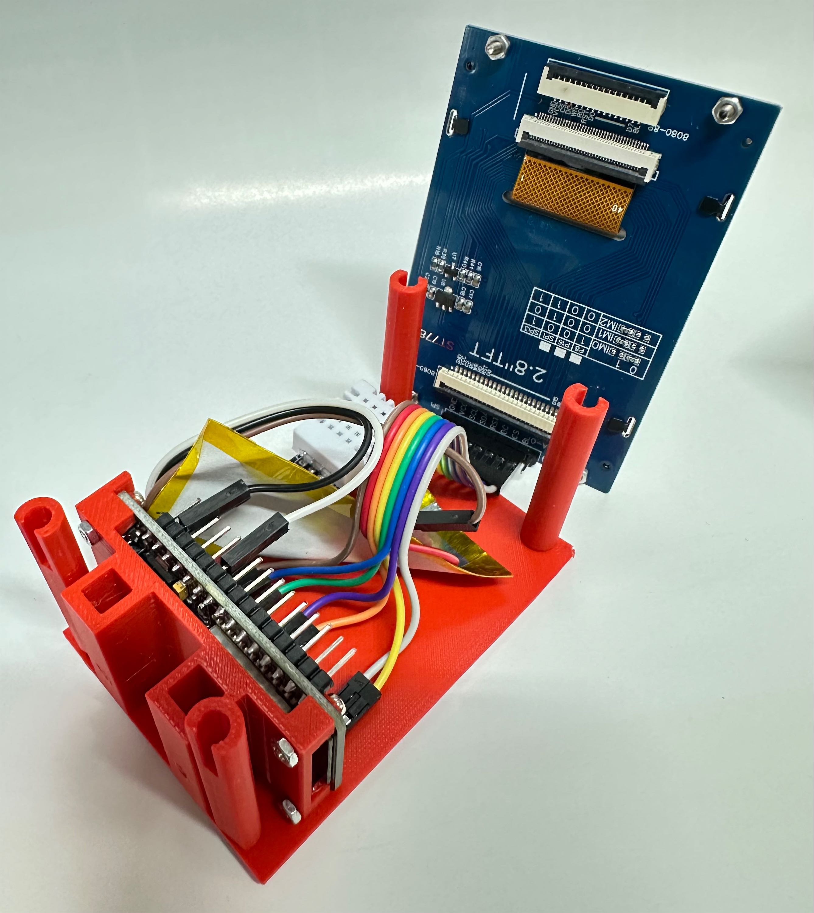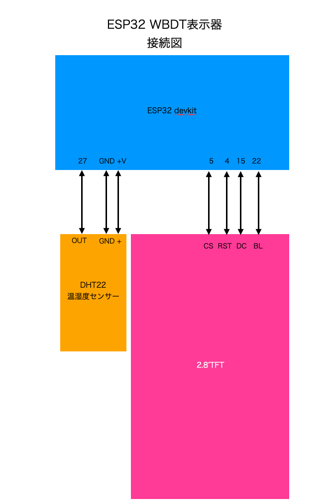 中身は単純。ESP32開発ボードにTH-22温湿度センサと2.8'TFT表示器を接続しただけ。