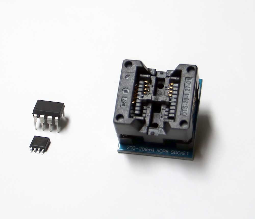 パッケージはDIPとSOPで共に8Pでレイアウトも同じだ。DIPは便利だけど、ソケット実装にすると大きくなりすぎるので、PCBを起こすならやはりSOPが良い。SOPをDIPに変換してROMライタで書くためには変換ソケットが必要。写真右のごついのがそれだ。