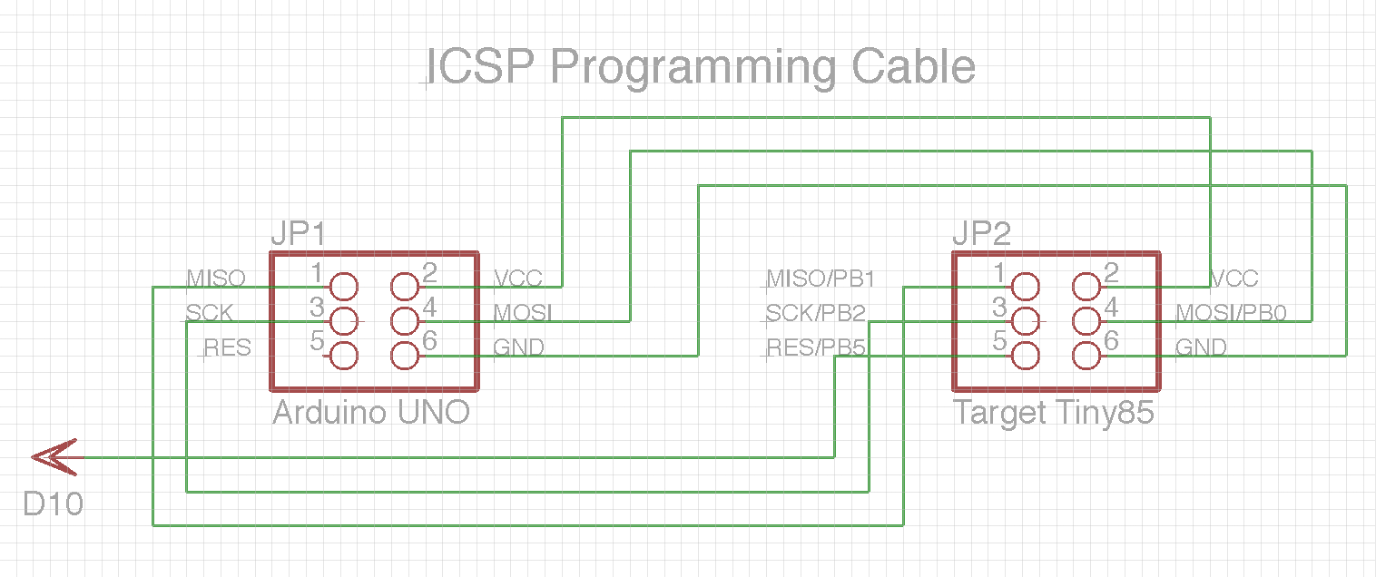そのためには予めPCBにICSPのピンを立てておく。そしてこのケーブルでArduinoと接続するのだ。