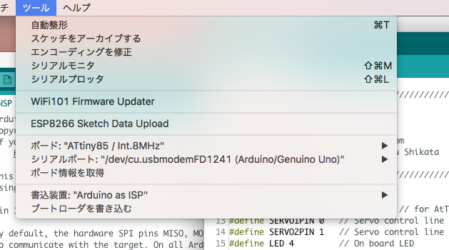 予めArduinoUnoにはArduinoISPのスケッチを書き込んでおき、「書込装置」は"Aduino as IDP"を選択しておく。