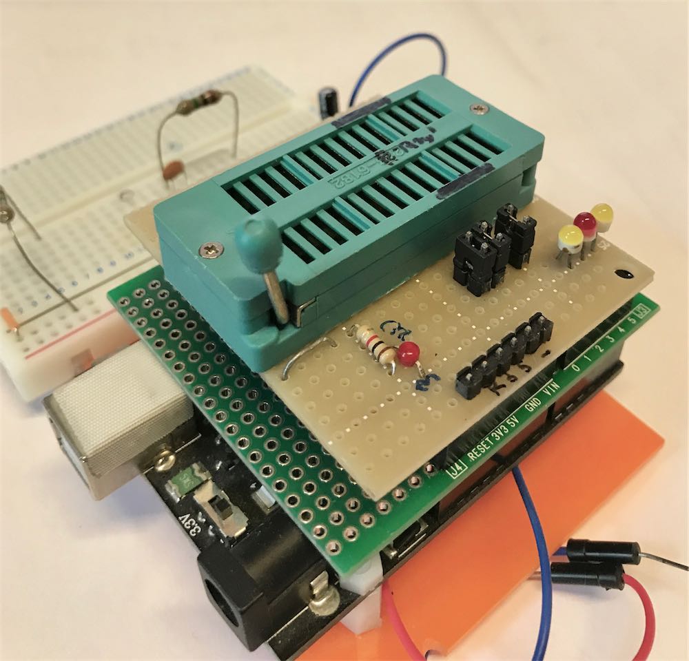 特に後者はUSBに繋いで使える汎用のボードも市販されているのが手軽だ。開発・実験はブレッドボードと、このボードでやっておいて、プリント基板を作ったら、チップを直接載せれば良いのだ。