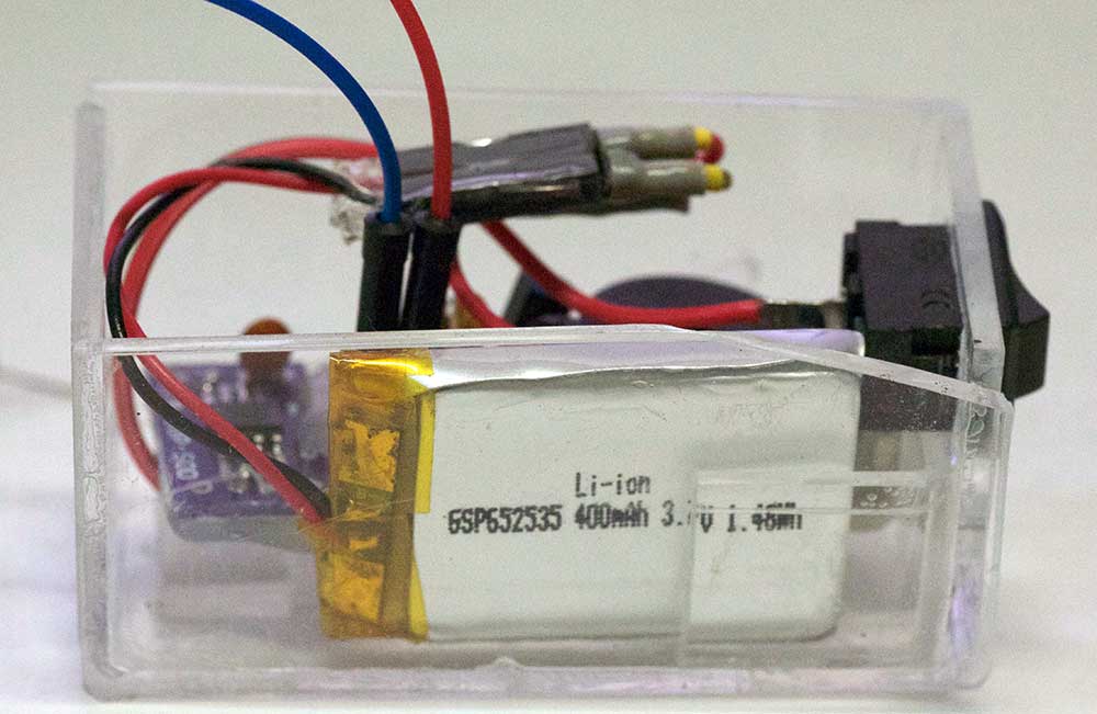 また、本体が小さいので、電源も小さくしたかったそこで、薄型のLi-Po(400mAh)との組み合わせになった。