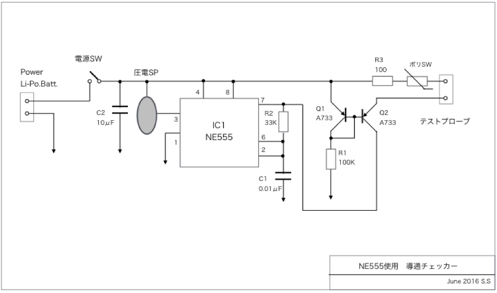 そこで、手元にあったNE555を使って発信器を作り、専用の導通チェッカーにすることにした。
